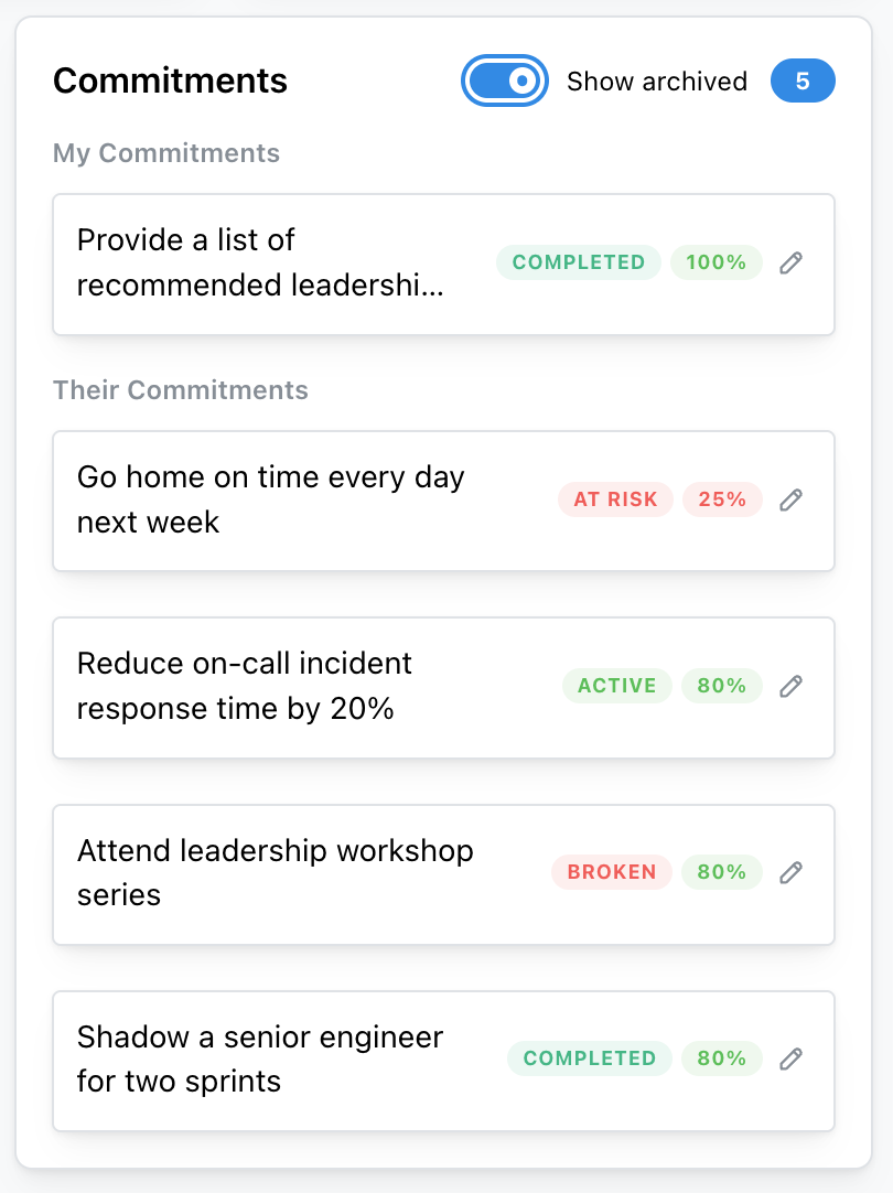 Commitments work similarly, but with more structure around accountability. When someone agrees to do something in a 1:1, whether it's the manager or the report, that becomes a Commitment. It has a description, an owner, a status, a confidence score (defaulting to 80%), optional success criteria, and a check-in date.