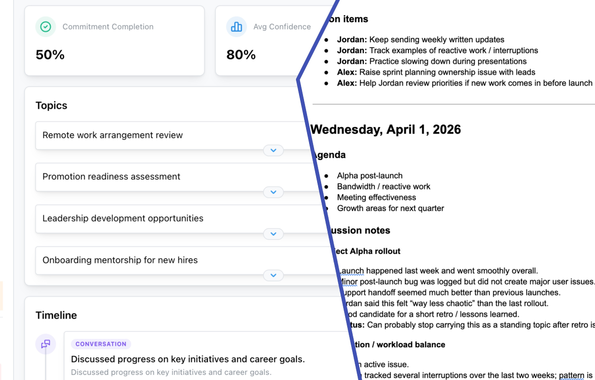 Ben Price March 18, 2026 10 min readEvery manager I know has the same ritual. Five minutes before a 1:1, you open a shared Google Doc, scroll past three months of half-finished bullet points, copy the leftover items to the top, and pretend that constitutes preparation. The meeting happens. Some things get discussed, some don't. You jot a few notes, close the doc, and forget about it until next week.