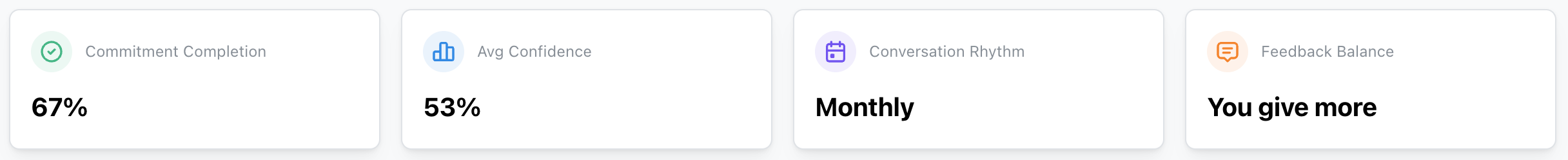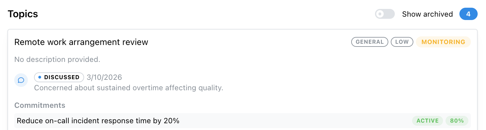 The Topics and Commitments model applies identically in all these contexts. The health score and coaching insights are currently scoped to direct manager relationships, but the conversational infrastructure, topics, commitments, highlights, reflections, is available for any relationship.